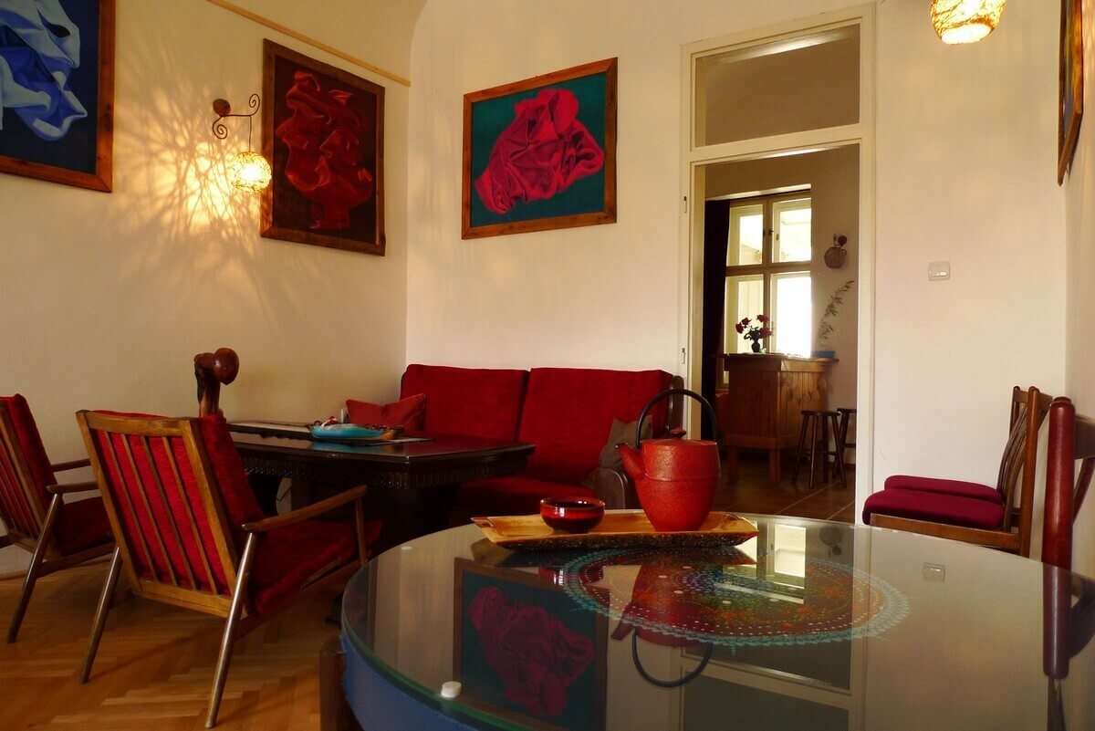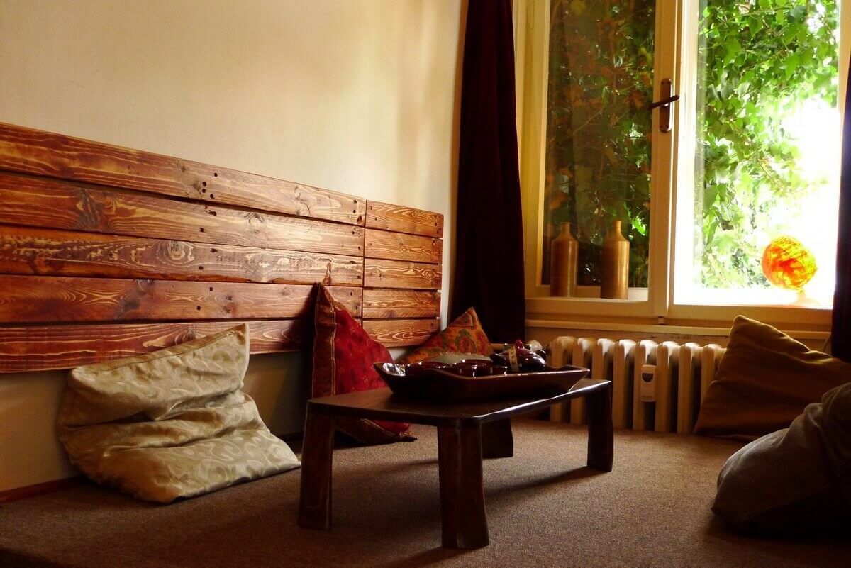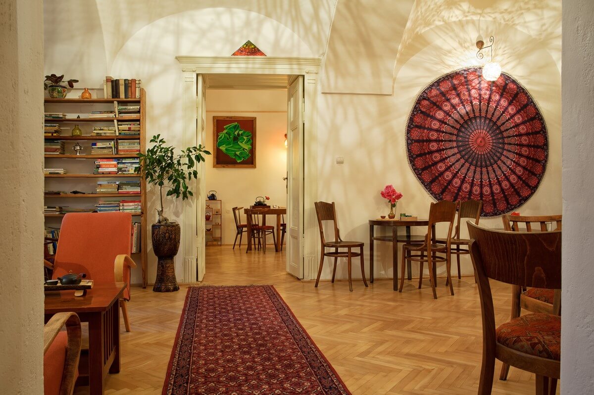 Zo Slnečnej miestnosti máte najlepší výhľad na pracujúcich čajmenov, na dvor a na príchod nových hostí. Budete mať všetko pod kontrolou a neobíde vás žiadny prichádzajúci hosť. Tu sa nestratíte – iba ak v našich tajomných mandalách, ktoré visia na stenách. Ak sa budete chcieť intelektuálne schovať, na blízku máte policu plnú kníh.